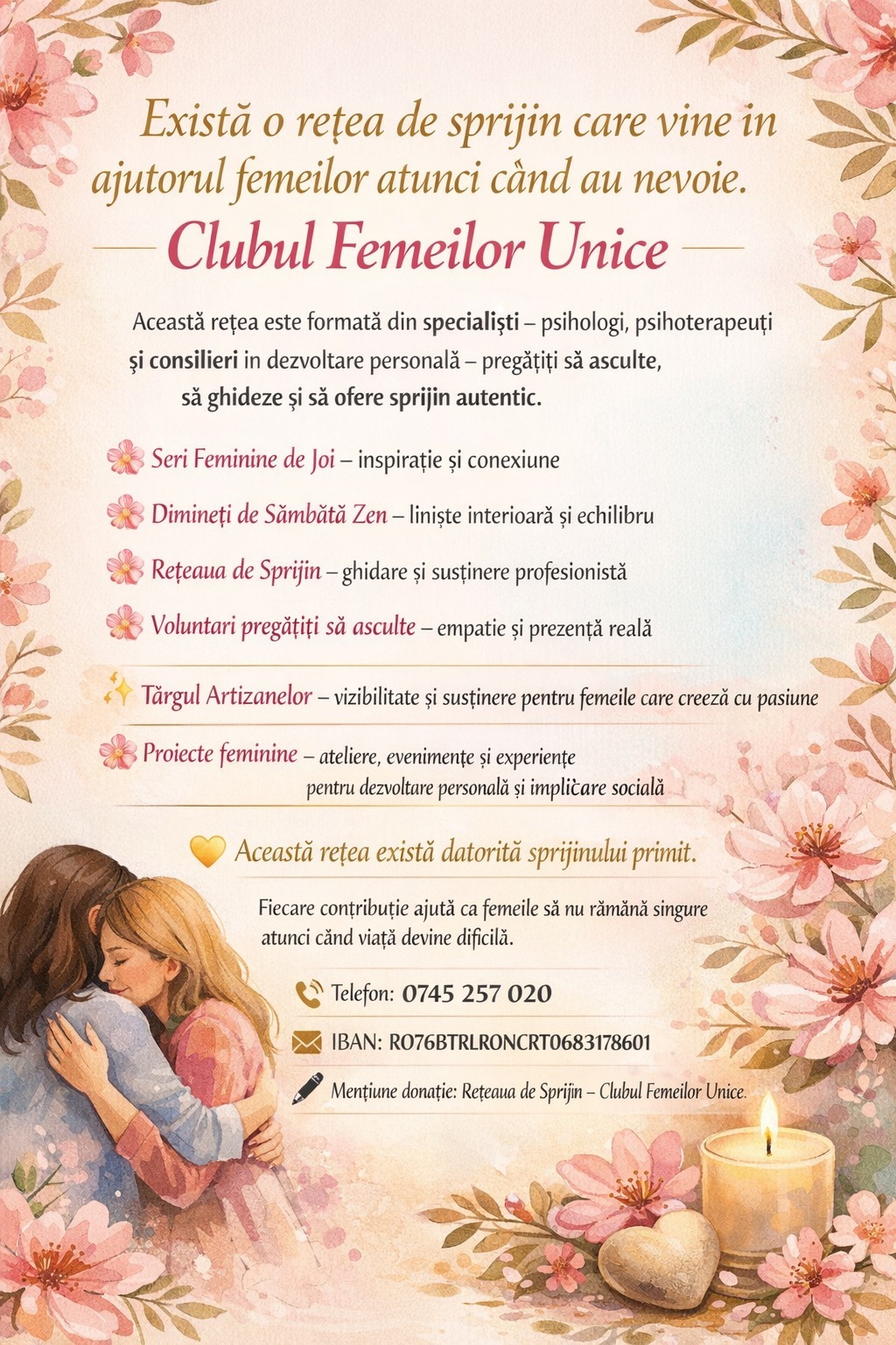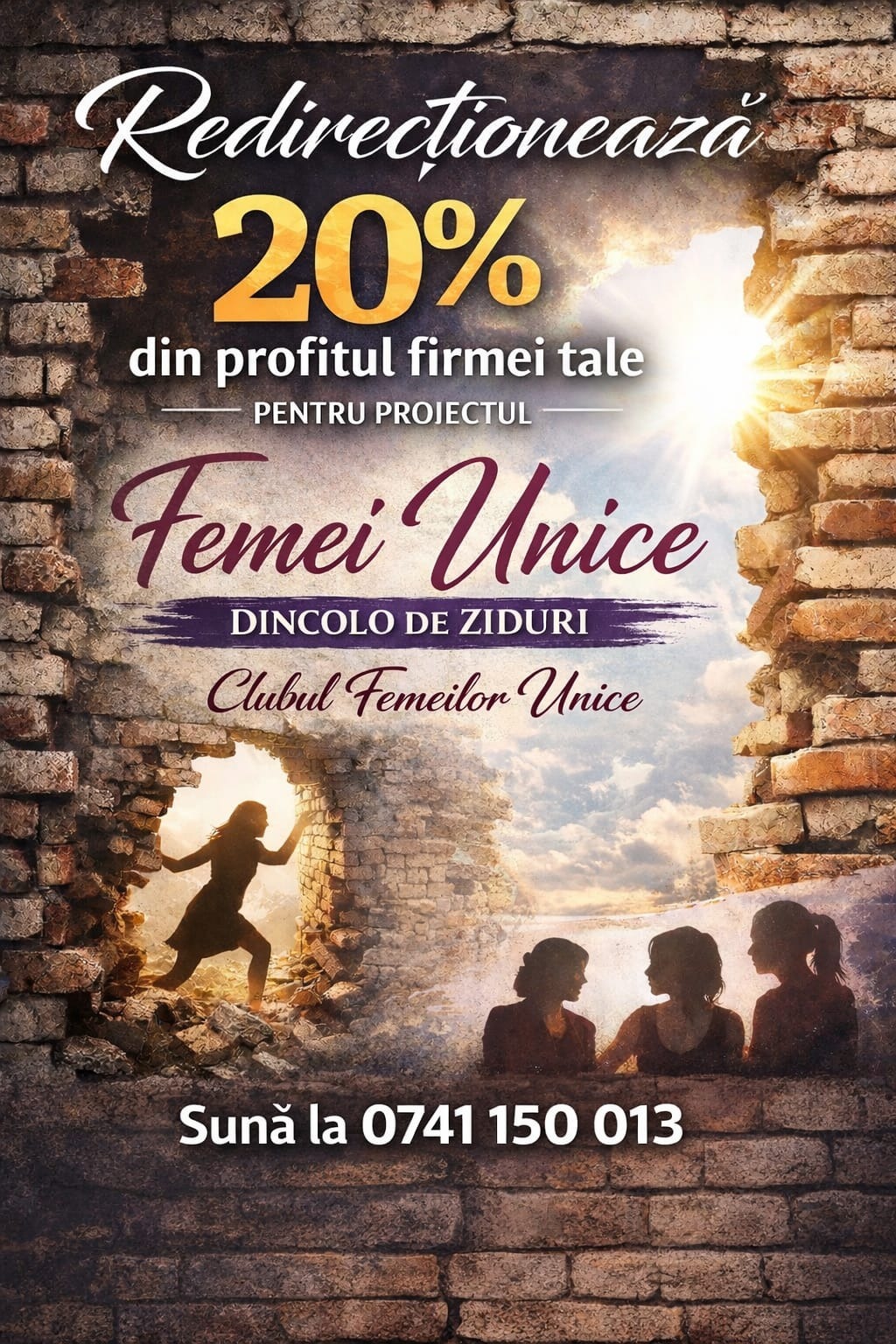 În luna martie, luna feminității, te invităm cu drag la Gala VIP „Femeie, fii tu!”, ediția a III-a, pentru a sărbători împreună 3 ani de povești, curaj și prietenii în cadrul Clubului Femeilor Unice. 📅 27 martie 2026🕕 Ora 18:00📍 Sala Marii Uniri, Arad Va fi o seară plină de inspirație, momente de eleganță și stil, mesaje emoționante și energie feminină.Martie este despre noi – cine suntem și cine alegem să devenim. Te așteptăm cu bucurie! 💖 Laura Mariș & Dana BologClubul Femeilor Unice 💌 Contribuția pentru participare: 80 lei/persoană, donație pentru susținerea activităților ClubuluiCont: RO76BTRLRONCRT0683178601 Te rugăm să confirmi prezența până luni, 23 martie, la 0741150013.