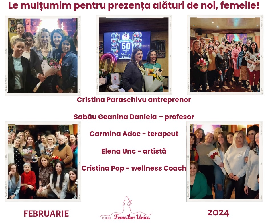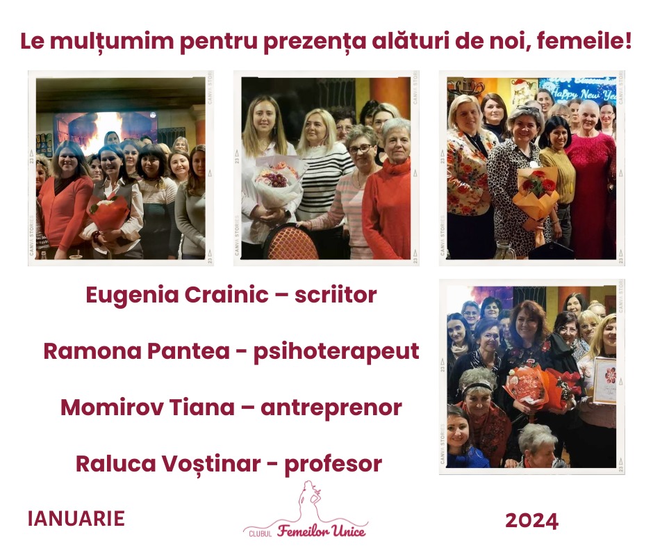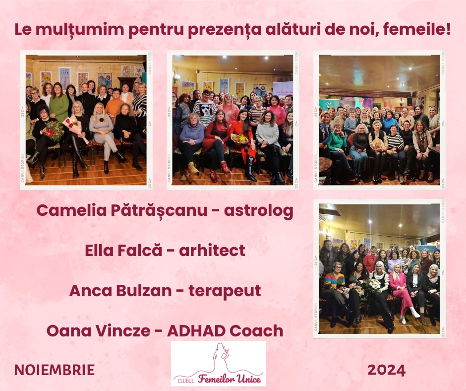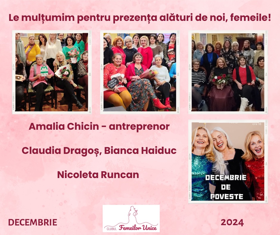 Târg de Crăciun la Budapesta - locuri ocupate! Atelier creativ Coronițe de Crăciun - Luna decembrie, Meldecor Flowers - rezervări loc 0751527349 - taxă participare cu tot cu coronița pe care o iei acasă aprox. 65 lei Târgul ARTIZANelor Arad - Arad, Ellis Hub, sâmbătă, 14 decembrie 2024 19 decembrie - Seară de poveste - Boeme cafe - rezervări 0741150013 Atelier de decorat turtă dulce - sâmbătă, 21 decembrie 2024 - rezervări 0745 257 020 - taxă de participare kit+10 turte decorate - 110 lei În vizită la bunicuțele de la Cuvin - sâmbătă, 28 decembrie 2024 - înscrieri 0741150013 La Clubul Femeilor Unice facem să ne fie bine!Hai cu noi, este loc și pentru tine!