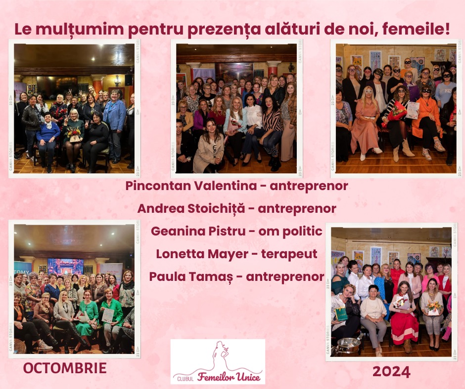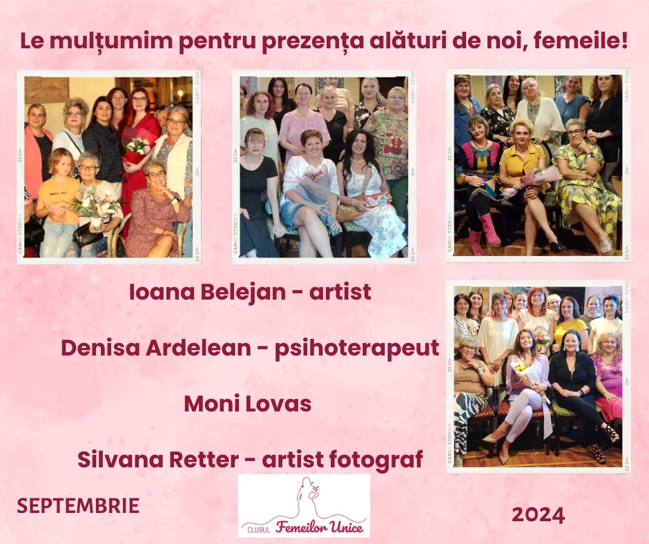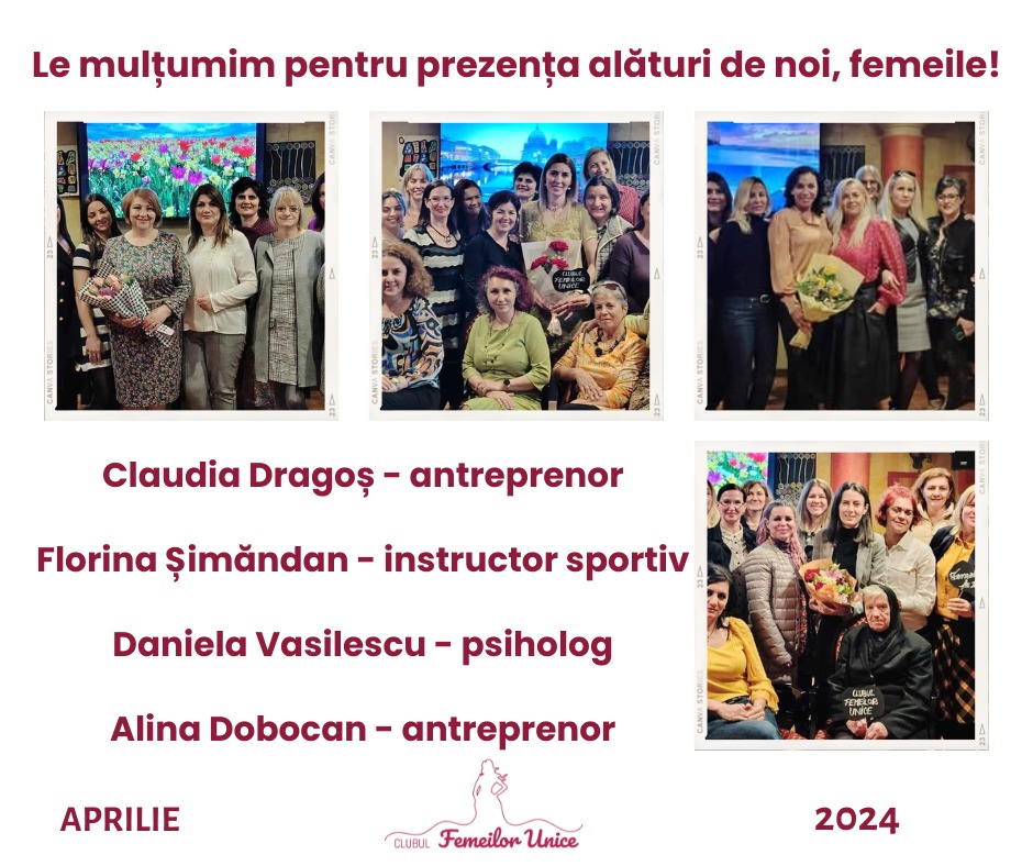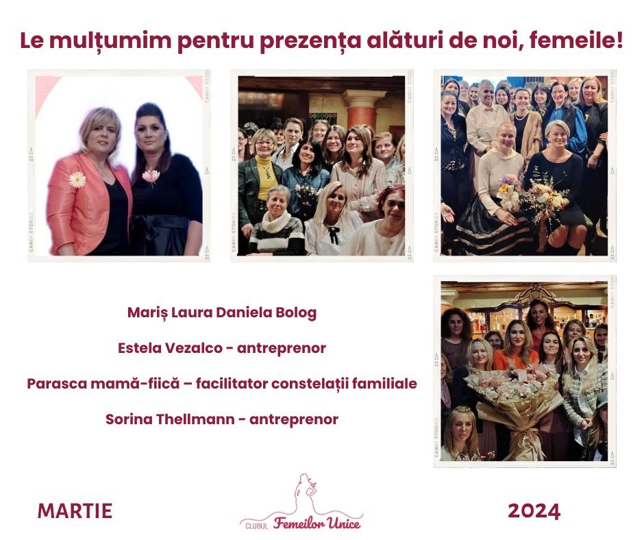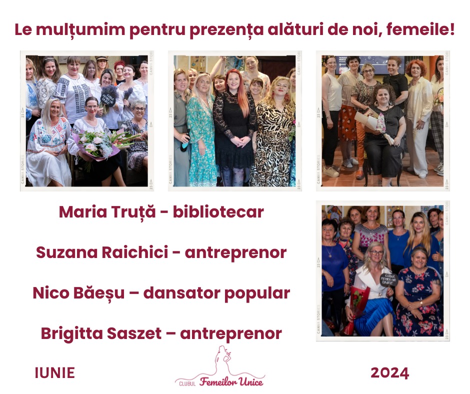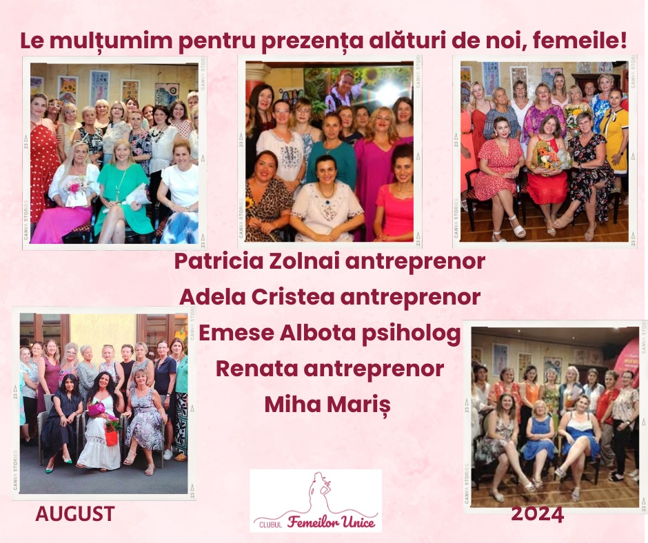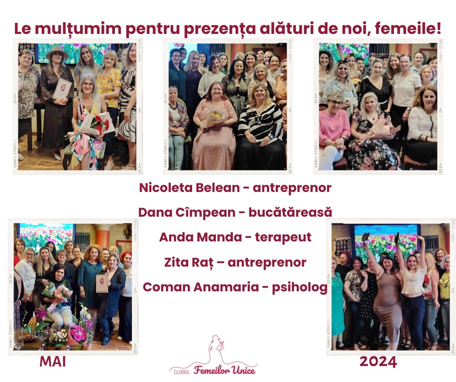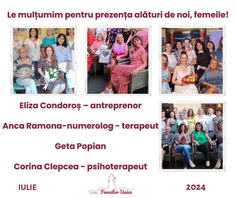 La Clubul Femeilor Unice facilităm accesarea puterii asupra propriei vieți a femeilor, astfel încât acestea să poată modela lumea din jurul ei.Cele peste 70 de evenimente organizate au contribuit la crearea unui Hub comunitar, o rețea de sprijin pentru și despre femei. 5 - 7 iulie 2024Aro PalaceBrașov APROAPE DE TINE – SESIUNI DE WORKSHOP FEMININProgramul evenimentului - sesiuni de workshop feminin, seri sociale și sesiune de yoga Înscrie-te acum! Sâmbătă - 6 iulie 10:00 - 17:00 CONSTELAȚII FAMILIALE cu Mirela PARASCA POPOVICI - facilitator - cost pachet acces 250 lei; 10:00 - 13:00 INTIMITATE cu Roxana PANĂ - psihoterapeut - cost pachet acces 200 lei; 13:00 - 15:00 PROSPERITATE cu Gena RUSU - instructor/terapeut holistic - - cost pachet acces 200 lei; 15:00 - 17:00 INDEPENDENȚA FINANCIARĂ cu Cristina PARASCHIVU - consultant financiar - cost pachet acces 200 lei; 17:00-19:00 SPIRITUALITATE cu Anda MANTA – energoterapeut - cost pachet acces 200 lei; Duminică - 7 iulie 10:00 - 11:00...